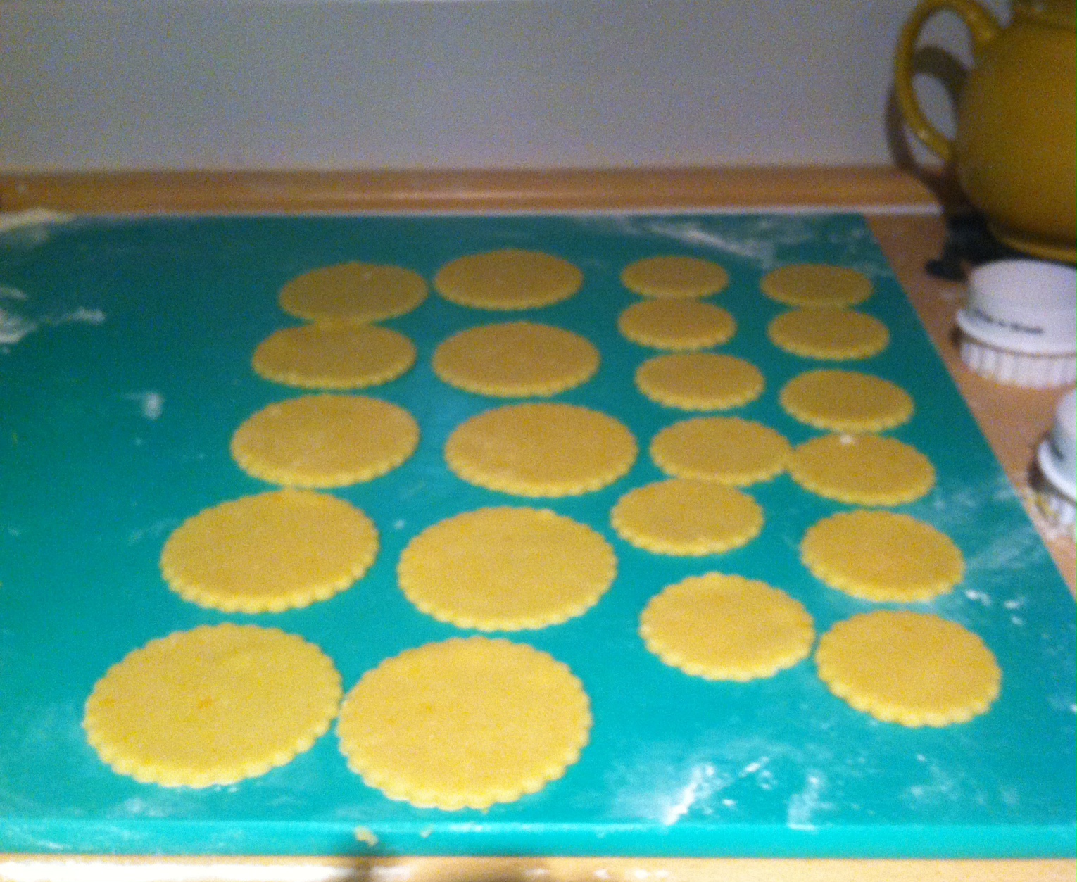 - Dust the surface with flour, then roll out the pastry (don’t make it too thick otherwise you’ll just have a mouthful of pastry). Depending on the size of your tin, cut out 12 large fluted rounds and 12 smaller ones. Lightly grease your tin and press the 12 large circles into the tin. Sp