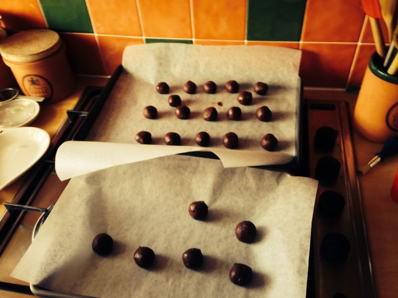 - Line an oven tray with baking paper. Drop in your truffles one by one into the melted cho