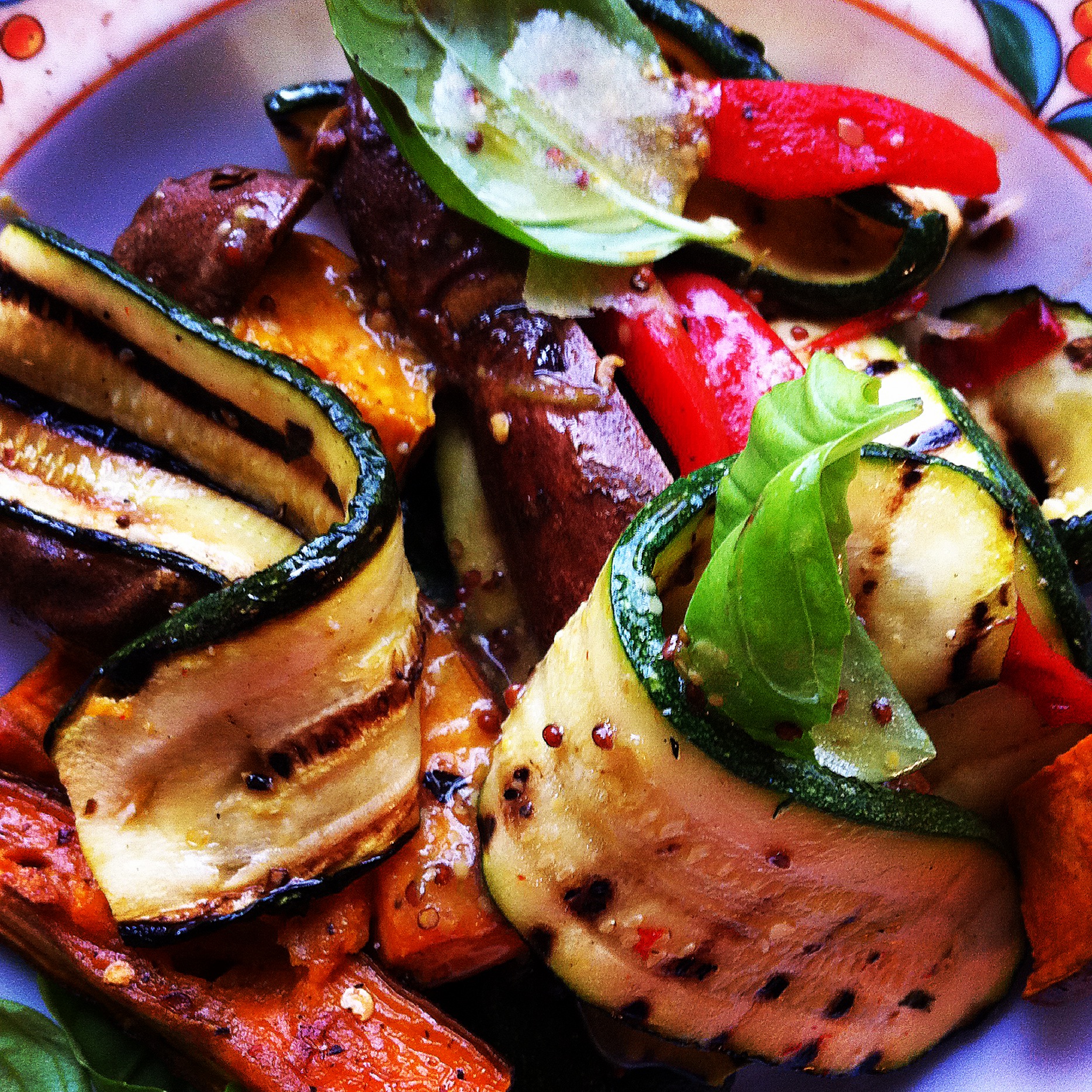 5. Remove the peppers from the bowl and take off the charred skin. Slice into thin strips. Place onto a large serving plate (or into your tupperware!), along with the sweet potatoes and cooked courgettes.