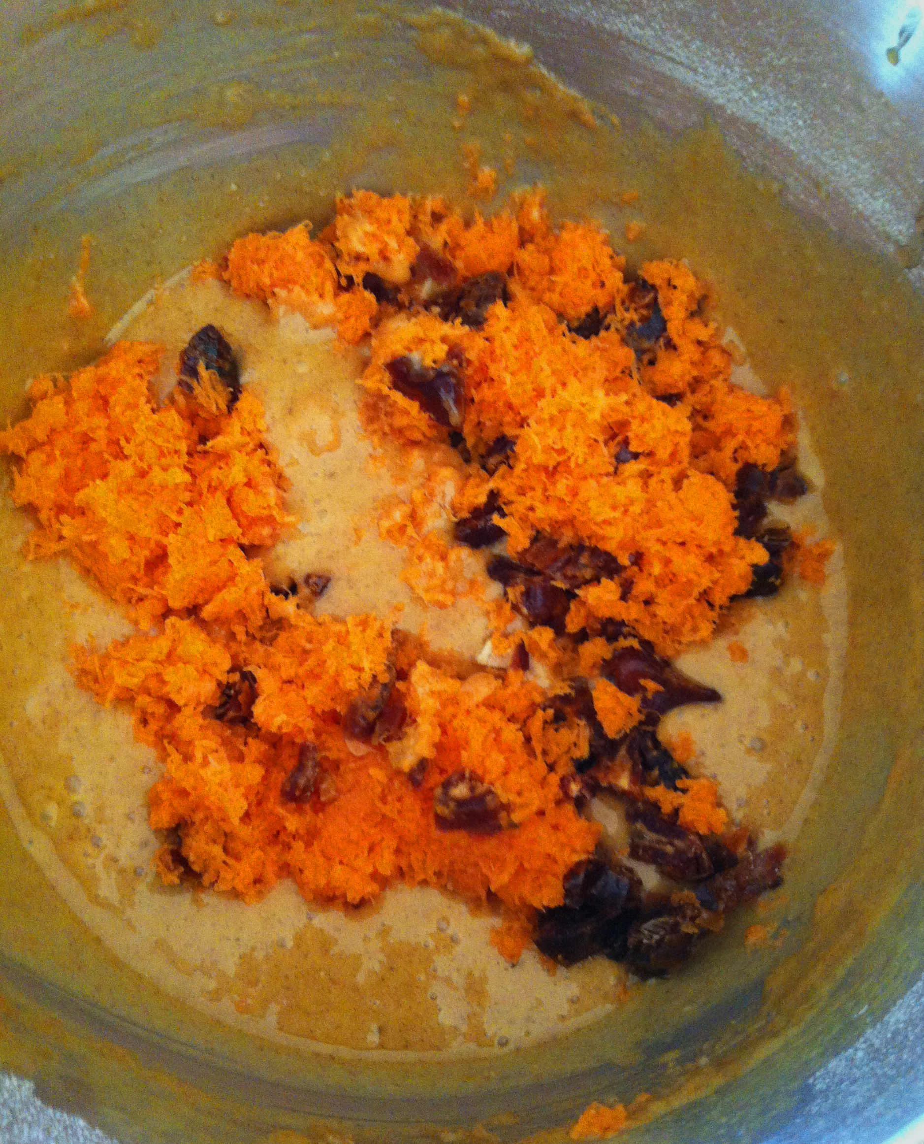 - Beat the eggs and add to the pan. Stir in the dates and carrots. Pour into the cake tin and sprinkle 2 level tablespoons Demerara sugar over cake and bake on centre shelf for 1 hr 20 mins. 6. Once cool, wrap up in cling film and leave for 2 to 3 days before eating. [If you want a fancy pattern on it, mix icing sugar and a dash of water to a paste, pour into a piping bag and zigzag over.]