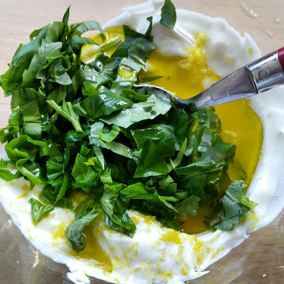 - In a separate bowl mix the yoghurt with remaining oil, lemon and basil