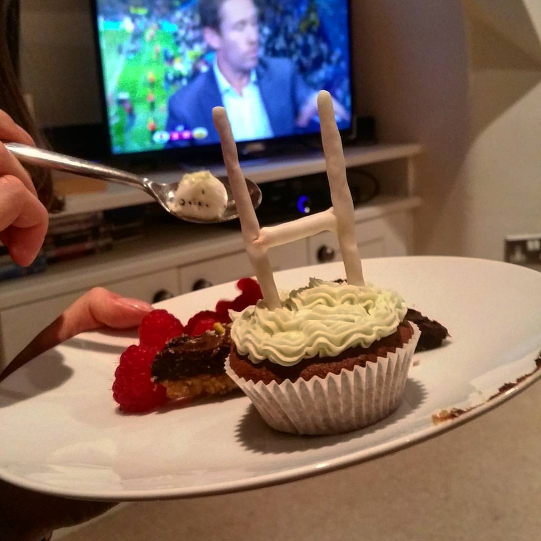 - For the rugby balls, roll a small ball of white sugar paste icing in the balls of your hand to form an oval shape. Score the top and sides with a knife in small dash like formations (———- ) Once you have covered the rugby ball, dip a cocktail stick in black food colouring and go over the scored icing. This creates a stitching effect. Once you’re happy, glue your rugby ball onto your cake (if you don’t have edible glue just use a bit of left over buttercream).