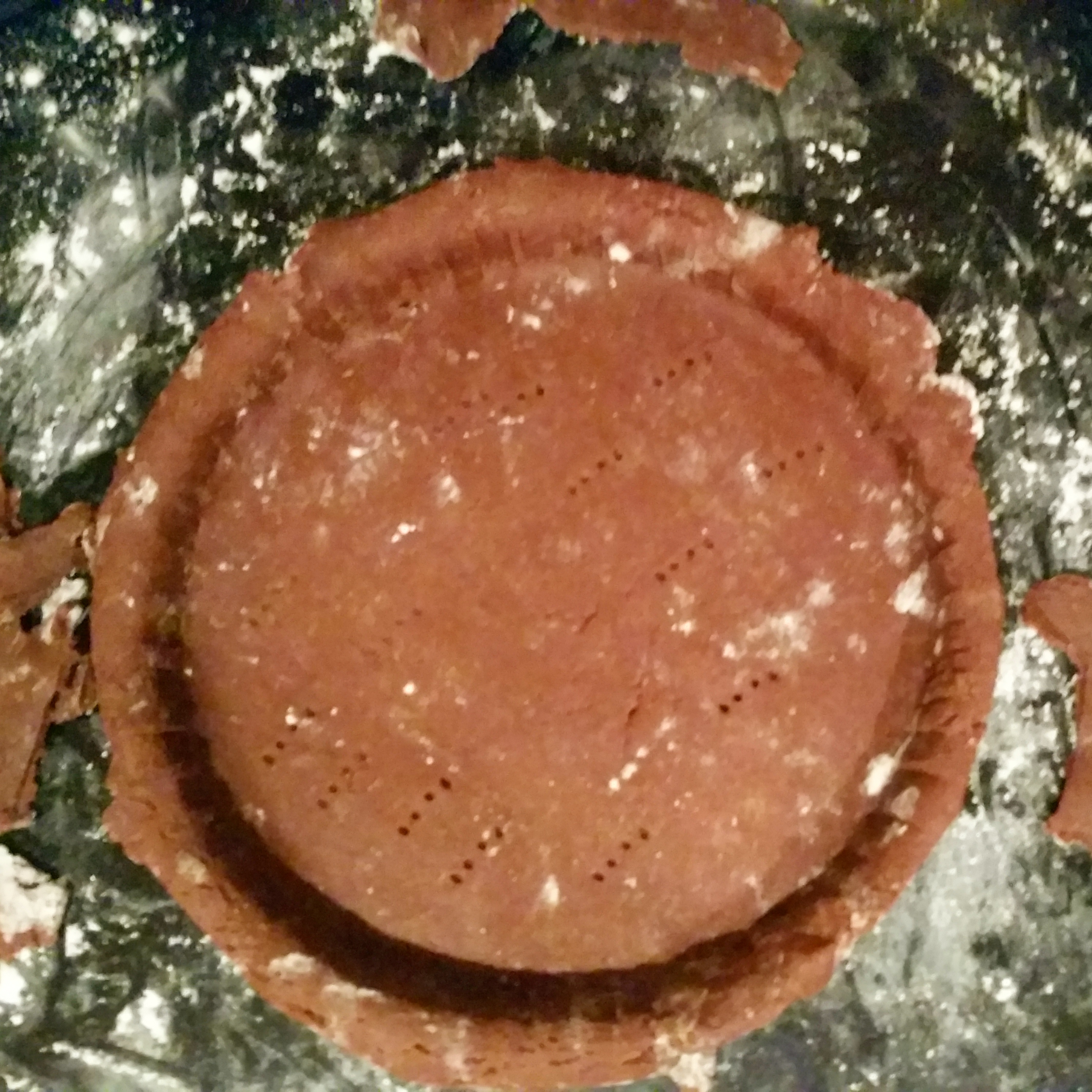 - Preheat the oven to 180˚C, gas mark 4. Make the pastry as on the previous page, adding the cocoa with the flour. Roll into a disc as thick as a £1 coin and big enough to fit a 25cm fluted tin. Drape the pastry over the rolling pin, lay over the tin and push into the base, leaving any excess hanging over the edge. Chill for 10 minutes.