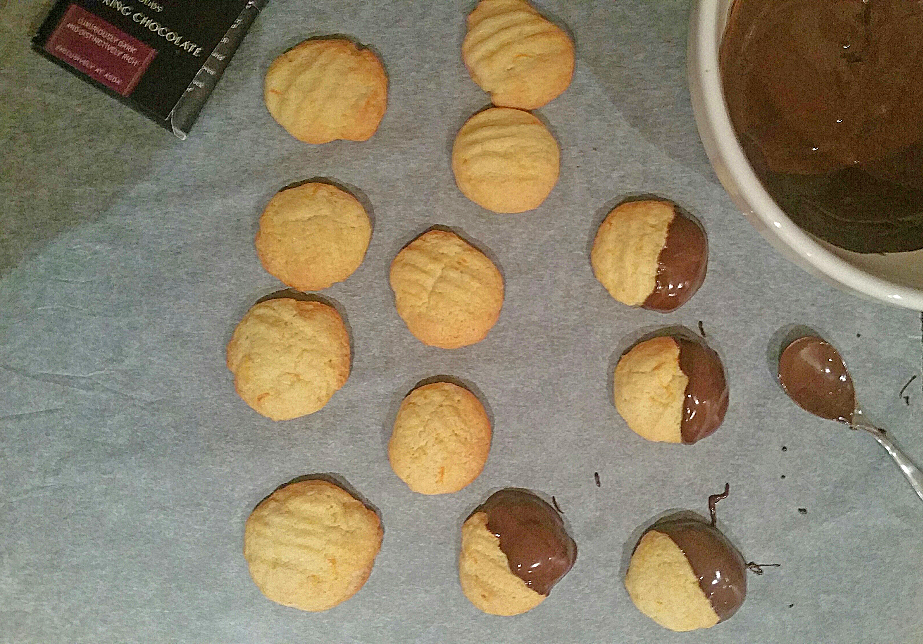 - Melt the chocolate and dip the biscuits half into the chocolate mixture. Place on greaseproof paper. Repeat until they have all been half dunked in chocolate. Grate some more orange zest over the biscuits to add colour and flavour. Leave to set.