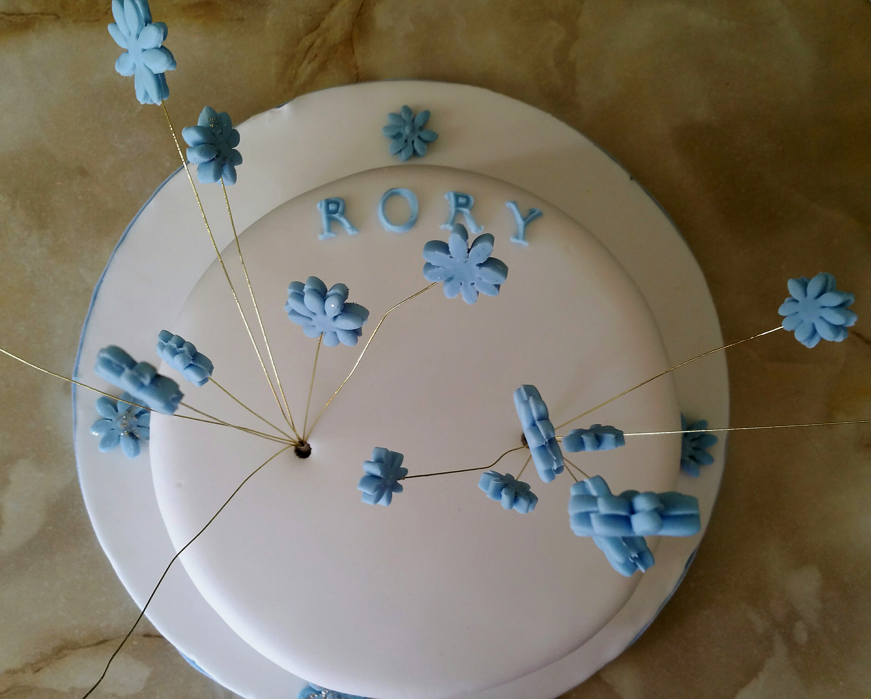 - Whilst the cake is firming up in the fridge, make the flowers. Roll a thin layer of blue icing and, using a patterned stamp of your choice, cut out the shapes. It looks better if you use a stamp of various sizes. I used a flower cutter which came in 3 different sizes. There are 2 ways of inserting the floristry wire. Either take one stamped flower and dap some edible glue into the centre of the flower, then place the wire on the glued part. Place another identical flower on top and gently press to seal. OR, you can roll the fondant slightly thicker, cut out the shape, and place a small amount of glue at the end of the wire before inserting into the flower. I experimented with both methods and they worked equally well. Repeat until you have about 12-18 flowers. Ideally you want to leave these to dry for as long as possible before inserting into the cake.